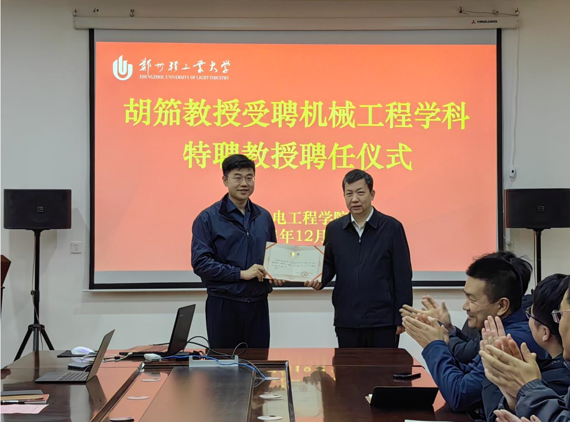 12月10日上午,黄色漫画 在东风校区西三楼215会议室举行了聘任同济大学胡笳教授为我校机械工程学科特聘教授的仪式。河南省机械装备智能制造重点实验室主任何文斌、省重点实验室副主任文笑雨、国际教育学院副院长付志军、车辆工程系的教师及学生代表参加了聘任仪式。