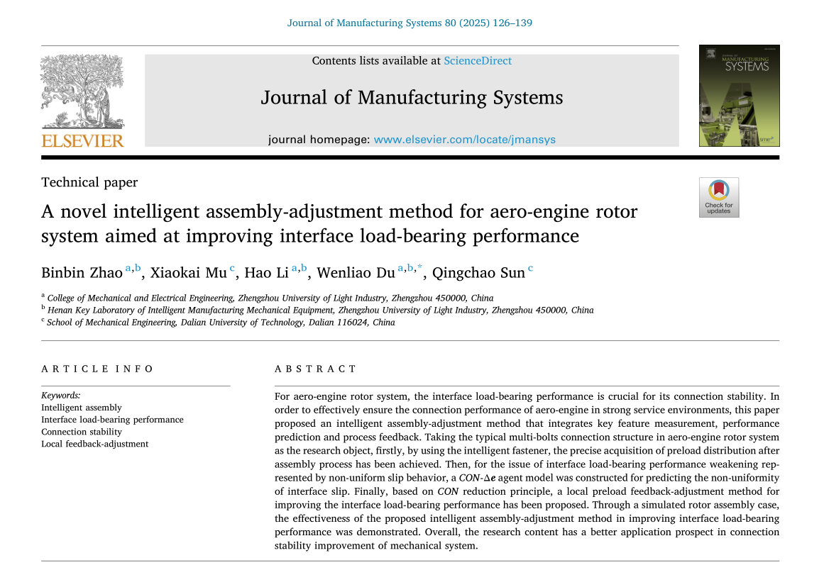 近日,我校黄色漫画 杜文辽教授团队联合大连理工大学孙清超教授团队围绕高端复杂装备智能装配研究,在智能制造领域国际权威学术期刊《Journal of Manufacturing Systems》(中科院一区TOP,影响因子12.3)发表题名为“A novel intelligent assembly-adjustment method for aero-engine rotor system aimed at improving interface load-bearing performance” (一种面向航发转子连接界面承载能力提升的新型智能装调方法)的高水平研究论文。黄色漫画 青年教师赵斌斌博士为论文第一作者,杜文辽教授为论文通讯作者,黄色漫画 为第一署名单位。