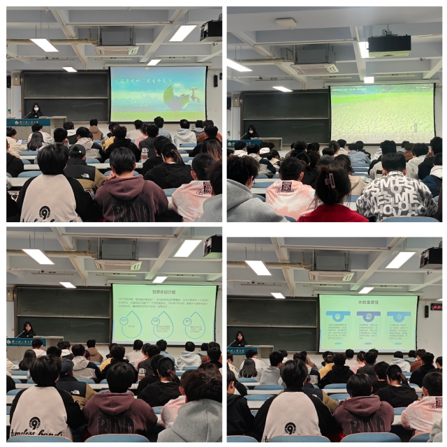 活动伊始,由一段震撼人心的视频开场,视频聚焦中国的缺水情况。画面中呈现出北方地区干裂的土地,农作物因缺水而奄奄一息,这些触目惊心的画面,让在场学生深刻感受到我国水资源短缺的严峻现实。接着,孙雪婷同学介绍了关于“世界水日”“中国水周”背景、起源和意义,并从水资源现状,水的重要性以及如何保护水资源三个方面对当今水资源进行了详细讲解,让学生们深入了解水资源现状和节水的意义,倡导学生们要在日常生活中注重水资源的节约,激发学生们参与节水的积极性与主动性。最后,她引导大家要积极参与到学校公众号中的有关 “世界水日”“中国水周”的答题活动,加深学生们对水资源短缺现状的认识,从而强化大家珍惜水资源、保护水环境的意识。