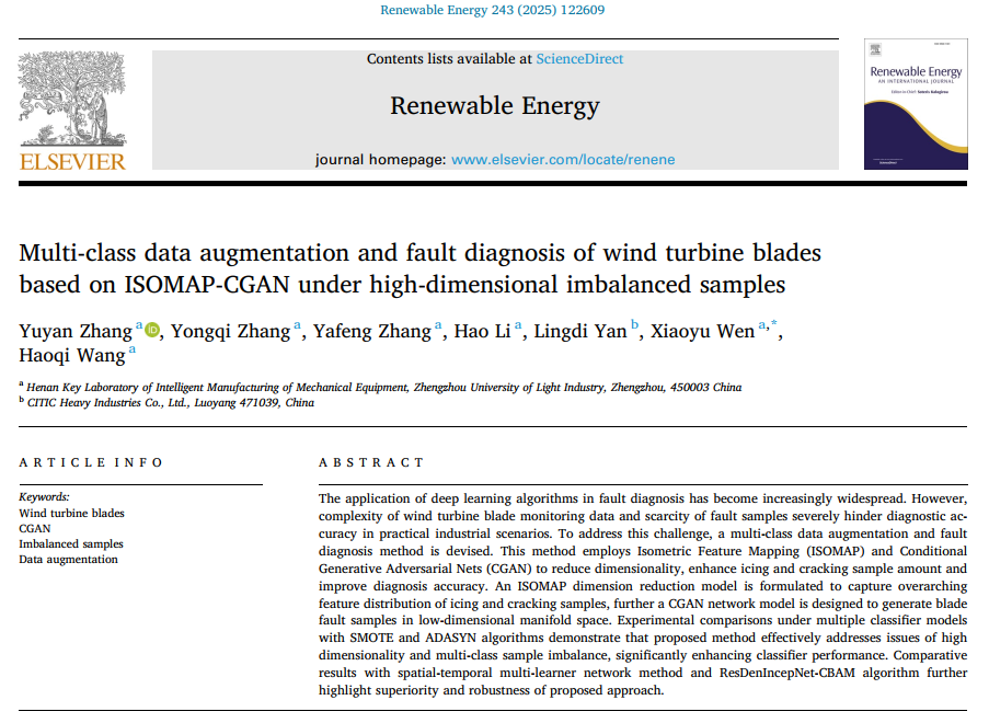 黄色漫画 李浩教授和张玉彦副教授团队在工程领域国际顶级期刊《Renewable Energy》(中科院一区TOP期刊,影响因子9.0)发表题为“Multi-class data augmentation and fault diagnosis of wind turbine blades based on ISOMAP_CGAN under high-dimensional imbalanced samples”(基于ISOMAP_CGAN的高维不平衡样本下风电叶片多类数据增强与故障诊断)的研究论文。