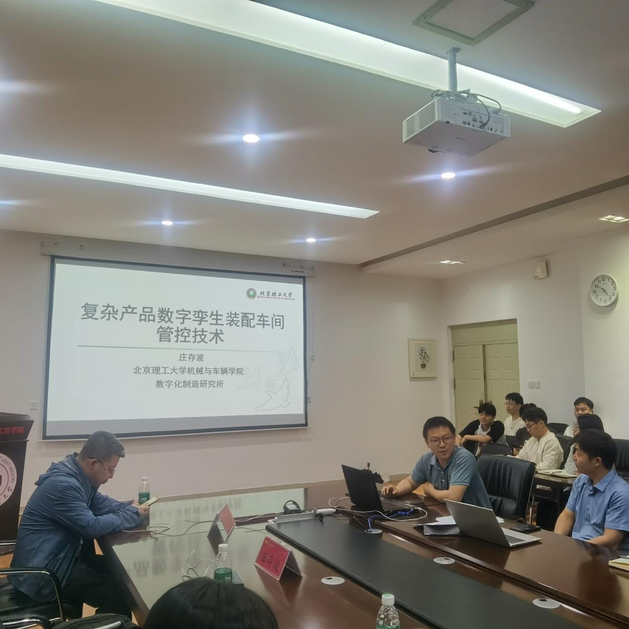 庄存波副研究员首先结合数字孪生体的发展历程,从模型和数据两个角度,分析数字孪生体的内涵;重点阐述了装配车间数字孪生体的构建方法,介绍了基于数字孪生的装配车间可视化监控、质量预测、过程追溯、动态调度等关键技术;分享了课题组的研究进展与下一步研究计划。在互动交流环节,参会师生与庄存波副研究员围绕复杂产品数字孪生装配车间智能管控技术展开了深入研讨。