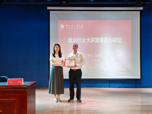 最后,陈璐向李静宇校友致谢,并颁发匠心讲坛嘉宾证书。她诚挚邀请广大校友回学院交流指导,与学生分享心路历程和成功经验,助力机电学子成长成才。