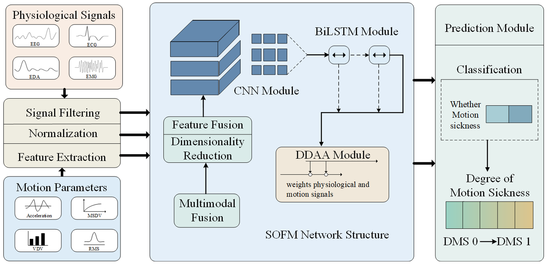 如何实现乘员驾乘体验的量化预测,是智能驾驶运动舒适性测评领域亟待解决的核心难题之一。在智能驾驶场景下,乘员驾乘体验受车辆加减速、转向等多种运动状态影响,传统测评方法多依赖主观评分或单一客观数据,存在精度不足、时效性差、难以动态适配复杂行驶工况等痛点。针对这一行业瓶颈,付志军教授团队联合加拿大Concordia大学、同济大学开展攻关,创新性提出一种基于改进注意力机制的多模态融合方法(SOFM),并构建时空融合深度学习预测模型(CNN-BiLSTM-DDAA),精准捕捉乘员生理信号(如心率、皮肤电信号、脑电信号等)与车辆运动参数(如车速、加速度、转向角等)的时空关联特征,有效突破多维异构数据在线融合的技术壁垒,完成从“主观感受”到“客观评价”的精准量化,实现智能驾驶车辆乘员舒适性的主客观融合高效测评,为智能驾驶车辆的舒适性优化设计提供了关键技术支撑。